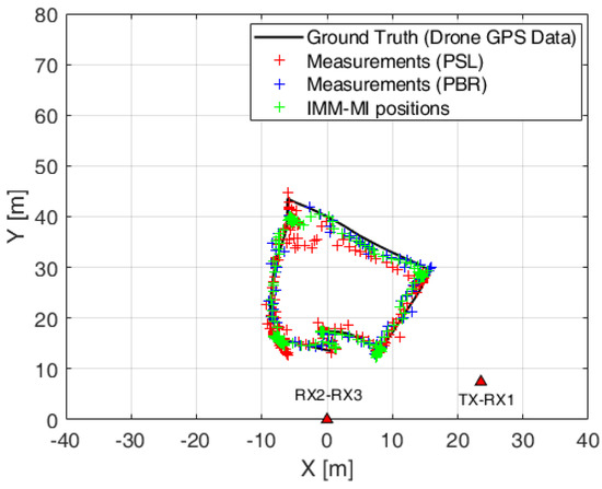 Finally, to evaluate the effectiveness of the proposed sensor fusion approach against the live scenario, in Figure 17, we report the drone positions estimated by the PSL (red crosses), PBR (blue crosses) and the position after the application of the proposed IMM-MI approach (green crosses). These results are compared with the ground truth, which, in this case, is represented by the drone GPS data (black solid line). This plot on the x-y plane makes it more evident that the IMM-MI is a valid solution for the drone’s surveillance, combining the good quality of PBR estimates with the gapless PSL position measurements achievable by exploiting the direct drone emissions. In fact, due to the small dimensions of the drone used for this experimental test, the PBR was able to estimate the drone location for a smaller fraction of the whole trajectory than in the human target case. The fusion of PBR and PSL sensibly improved the continuity of the measurements and effectively used the identification of the stop intervals to improve the performance.