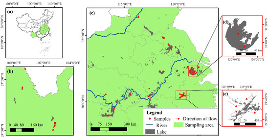 Distribution of the sampling sites and examples of lakes with different trophic states: (a) location of sampling area in China; (b) sampled lakes in the Yunnan-Guizhou Plateau; (c) sampled lakes in the upper reaches of the Huai River, the middle and lower reaches of the Yangtze River; (d) Lake Taihu (eutrophic states) and (e) Lake Qiandaohu (oligo-mesotrophic states).