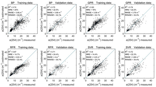 Performance evaluation of the a(254) retrievals using the machine learning algorithms (i.e., the BP neural network, GPR, RFR and SVR models); training results are shown on the left, and validation results are shown on the right.