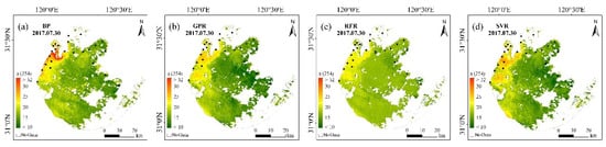 CDOM values produced by the OLI imagery using the different machine learning models in Lake Taihu (30 July 2017); the black dots show the locations of the in situ sampling points. (a–d) represent BP, GPR, RFR and SVR models respectively.