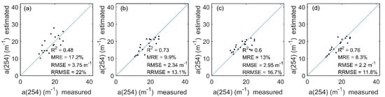 In this paper, the coefficient of determination (R2), mean relative error (MRE), root mean square error (RMSE), and relative RMSE (RRMSE) between measured and estimated CDOM absorption coefficient were used to evaluate the performances of all four machine learning approaches.