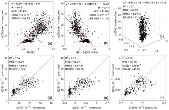 Training and validation results (R2, RME, RMSE and RRMSE) obtained using empirical predictive algorithms. (a–c) are the training results for y = a × (Bi/Bj) + c), y = a × ((Bi − Bj)/(Bi + Bj)) + c and y = a × Bi + b × Bj + c, respectively, and (d–f) are the validation results.