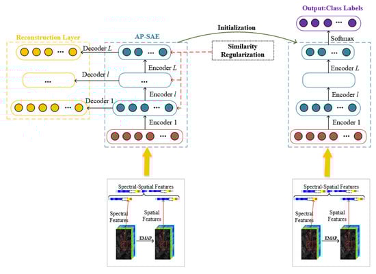 The principle of AP-SAE proposed is shown as Figure 5. Suppose that the proposed AP-SAE consists of L stacked AE, and the hidden layer dimension of lth AP-SAE is , where . Let denote the training set, where is the spectral-spatial feature of the ith training sample and N is the total number of training samples. So the lth AP-MAE has two parts: one part is an encoder to learn the feature mapping matrix, another part is a decoder to restore the input of AP-SAE with Sam constraint. For the lth AP-SAE, let be the weights of the hidden layer, be the data fed into the lth AP-SAE which is equivalent to ( when l = 1), and be the restore of input . The process is formulated as