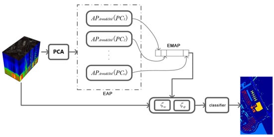 In order to alleviate the problems of “same object with different spectrum” and “same spectrum foreign object” in hyperspectral image classification, and reduce the probability of misclassification of edge pixels, spatial features are introduced into hyperspectral image classification features. In order to make full use of the spatial information in hyperspectral images, AP is used in this paper to extract the spatial information in multi-scale. The concept of AP is based on morphology profiles (MP), which is constructed based on the repeated use of openings and closings by reconstruction with a structuring element (SE) []. The MP has some limitations because of SE’s properties; to overcome these limitations, morphological AP has been proposed. AP can analyze many geometric attributes such as area, standard deviation, and the diagonal of the box bounding the regions, and in this way various spatial information can be obtained according to different attributes.