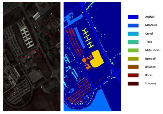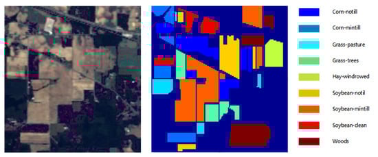 In this experiment, the performance of the proposed algorithm is evaluated by three hyperspectral images. The first one is Pavia University (610 × 340 pixels) and it has been acquired by the ROSIS-03 sensor with 1.3 m spatial resolution over the city of Pavia, Italy. They possess 115 bands with a spectral coverage ranging from 0.43 m to 0.86 m. After the elimination of 12 noisy bands, 103 bands have been left. here are 9 representative categories. Figure 6 shows the false-color image and ground-truth map. The Salinas is the second data set used for HSI classification. It contains 204 spectral bands (removing 20 water absorption bands). The data set contains 512 × 214 pixels with the spatial resolution of 3.7 m. There are 16 representative categories. Figure 7 shows the false-color image and ground-truth map.The third data set was acquired by the airborne visible/infrared imaging spectrometer. This data set is obtained from an airplane. The size of the hyperspectral image of each channel is 145 pixels × 145 pixels, and it has 220 spectral bands in the wavelength range of 0.4 m–2.5 m. The spectral bands are removed by removing the water absorption band. The number is reduced to 200. Figure 8 shows the false-color image and ground-truth map.