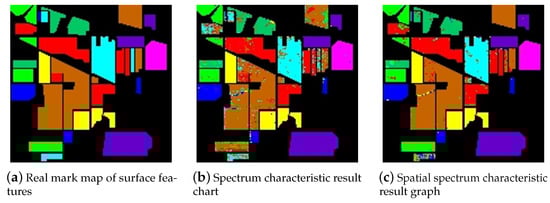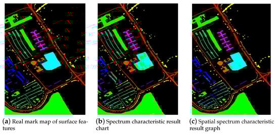 Figure 9, Figure 10 and Figure 11 show the classification result map of three datasets, including the real mark map of ground features, the classification result map based on spectral features and the classification result map based on spatial spectral features.