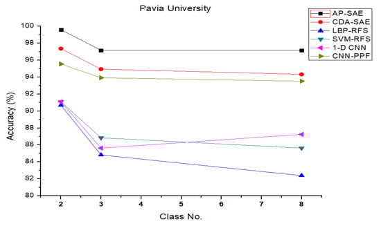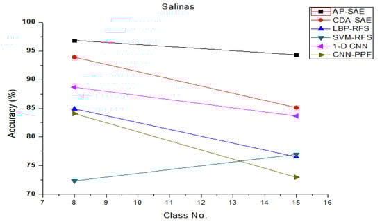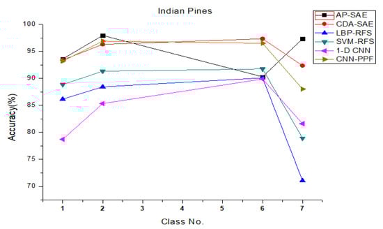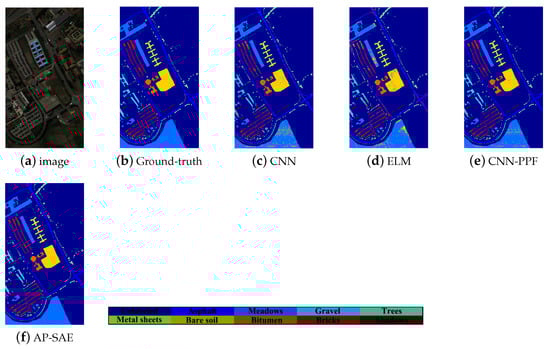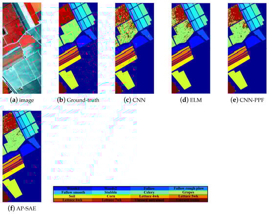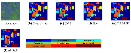 In order to quantitatively evaluate the effectiveness of the AP-SAE framework proposed in this paper, a comparison between some of the latest hyperspectral image classification methods and the method proposed in this paper is essential, with which the effectiveness of the method proposed in this paper to integrate depth features and spatial spectrum features can be verified. The latest hyperspectral image classification methods are Compact and Discriminative Stacked Autoencoder (CDASAE), local binary pattern (LBP)-ELM, 1-D CNN, SVM-random feature selection (RFS) and CNN-pixel-pair feature (PPF) methods. Among them, CDASAE [] adds discriminant condition constraints and regularized diversity constraints to the SAE structure. LBP-ELM [] uses LBP to extract local hyperspectral data features, and uses ELM to classify the extracted features. SVM-RFS [] is to use SVM-based system and RFS to achieve hyperspectral image classification. 1-D CNN [] is to use CNN to directly extract the spectral information of hyperspectral data to achieve classification. CNN-PPF [] is to use CNN to learn PPF features of hyperspectral images, where PPF features are obtained based on the information of pixels and their neighboring pixels.