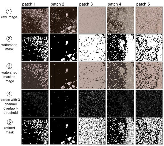 Synthetic image creation. Five examples of our synthetic image creation pipeline extracted from our training set images. Our watershed segmentation algorithm in step 2 is applied sequentially for a total of three times. We fill masked-out areas in step 3 with open water images sampled at random. We find three channel overlaps in step 4 using an adaptive threshold. Refined masks in step 5 are obtained by subtracting overlapping areas from step 4 from watershed masks in step 2. Imagery copyright Maxar, Inc., Westminster, CO, USA, 2021.