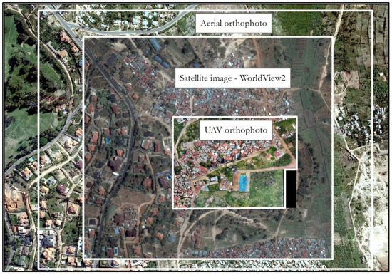 As shown in Table 1 and Figure 3 below, the orthophoto based on aerial images acquired in 2008/2009 with a digital camera on board an airplane was provided by the RLMU, and the satellite image was obtained from the Image repository of the University of Twente (ITC). The UAV images used for this research were collected in 2015 with a DJI Phantom 2 Vision Plus quadcopter at a flying height of 50 m. For the study, a total of 1172 geotagged nadir images were captured, and only 954 were obtained. However, an average of 85% forward and 75% side-overlaps was achieved. An orthophoto covering 950 m2; with a spatial resolution of 3.3 cm and a radiometric resolution of 8 bits was produced with Pix4DCapture software. The final orthophoto with a positional accuracy of 6.0 cm was produced based on 13 premeasured ground control points with Leica GNSS with an accuracy of 2 cm [8].