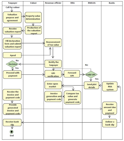 Ministerial order N° 005/12/10/TC of 22 June 2012 determines the modalities for the implementation of law N° 59/2011 of 31 December 2011. Ministerial order N° 005/12/10/TC of 22 June 2012 determines the modalities for the implementation of taxation law. It specifies the process and suggests the steps to be followed by the taxpayer for all types of taxes. The steps and key actors involved in property tax (fixed asset tax) are visualized in Figure 5 below. These include RRA, districts, and taxpayers, Rwanda Land Management and Use Authority (RLMUA), valuers, Institute of Real Property Valuers (IRPV), and Rwanda Development Board (RDB).