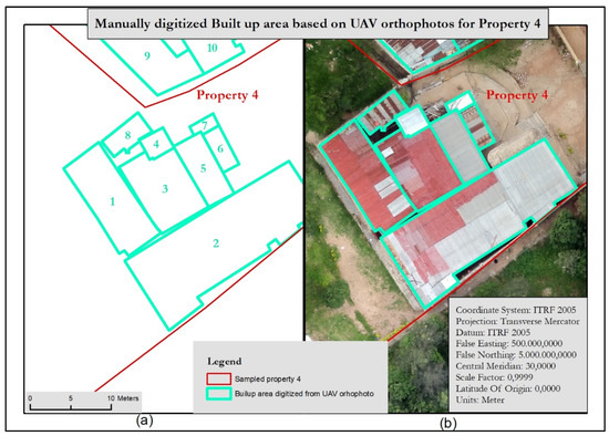 Digitized building footprints from UAV-orthophoto of property 4 (a). Footprint outlines overlaid on the UAV-orthophoto (b).
