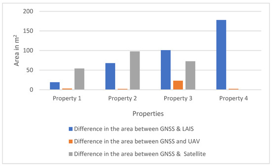 Evaluation of the spatial accuracy was also done through a comparison of the area of property 1, 2, 3, and 4 digitized over the three remote sensing images and compared with the reference data measured with GNSS. As shown in Figure 15, since the resolution of the UAV image is much higher than the other images, the digitized area is much closer to the reference data. It should be mentioned that due to the coarse resolution, property 4 was not clearly visible for digitization on the satellite image. Therefore, it is missing in the figure below.