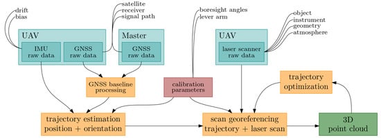 For the analysis of the system accuracy, the influencing parameters and the basic principle of UAV-based laser scanning are relevant. The concept is always based on sensors to localize the UAV with position and orientation, as well as sensors to acquire the environment with a laser scanner and an optional camera. The entire processing, starting with the raw data (blue boxes) and ending with the 3D point cloud (green box), is shown in Figure 1 with additional processing steps (orange boxes) and potential error sources, discussed later.