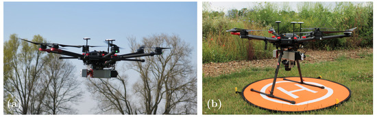 DJI Matrice 600 platform with the RIEGL miniVUX-2UAV laser scanner in flight (a) and on the ground (b).