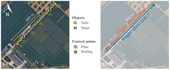 Study area for the analysis of single strip measurement with included objects (a) and the two flight directions of the individual measurements (b), © https://www.google.de/maps/ (accessed on 14 May 2021).