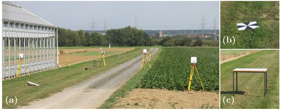 The study area used for the single strip measurements is located at the Campus Klein-Altendorf near Bonn and is shown in Figure 3a with additional objects that were arranged over the entire area with a length of about 300 m.