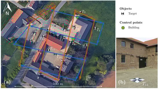 A reference point cloud is used for most of the evaluation aspects described in Section 2.2. The point cloud for the first study area was acquired with a Leica ScanStation P50 TLS and a target-based registration using BOTA8 (Bonn Target 8) laser scanning targets [42], shown in Figure 4a. To cover the entire study area, 16 viewpoints with 29 target locations were required, which were measured with the scanner resolution setting of 3.1 mm @ 10 m. In addition, the viewpoints were planned next to the objects along the road and near the control points, which are defined by attached targets (pillar or building) shown in Figure 3. These control points are used for georeferencing the point cloud and are part of an evaluation environment [1], which consists of a dense network of 37 control points in total. The control points are determined in a network adjustment based on measurements from total station, GNSS and leveling, which results in an estimated standard deviation of <0.1 cm. Measurements of the network were carried out in two consecutive years to verify the stability of the control points included. Further information about the measurements and methodology can be found in Heinz [1]. The coordinates of all control points are given in the official German coordinate system ETRS89/UTM32 (European Terrestrial Reference System 1989, Universal Transverse Mercator, Zone 32) for positions. Furthermore, the heights are given in physical heights (DHHN16, German Main Height Network 2016) and also ellipsoidal heights (GRS80, Geodetic Reference System 1980). Subsequently, the control point coordinates are used in the registration of TLS viewpoints to process the georeferenced point cloud. The processing of TLS measurements was done using the Leica Cyclone processing software. The registration error related to control points is given with a RMSE (root mean square error) of 0.5 cm. To control the reference point cloud, additional RTK-GNSS measurements were performed at two different epochs on this day, which showed a RMSE of the reference point cloud <1 cm for the height component. For the second study area with the multiple strip measurements, the creation of the reference point cloud is done quite similar as for the first study area, using a Leica ScanStation P50 and a georeferencing based on known control points as already described. The registration error related to the control points is given with an RMSE of 0.8 cm for the second study area and is further verified by RTK-GNSS measurements of the distributed targets, which are again in a range <1 cm. Therefore, the absolute accuracy described by the RMSE of the georeferenced point cloud in both study areas is much higher than the expected accuracy of the UAV-based laser scanning system measurements and can be used as a reliable reference.