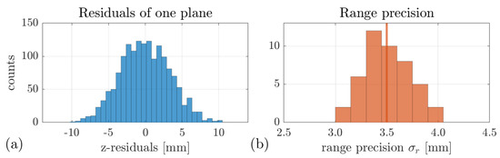 Evaluation of point cloud noise with residuals regarding plane estimation for an example plane (a) and the histogram of all range precision estimated based on four data sets (b).
