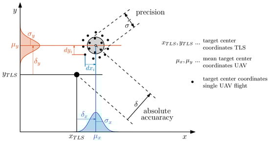 Relation of target center coordinates from TLS to multiple estimates of the same target from UAV data sets. Included quality parameters are the absolute accuracy and precision.
