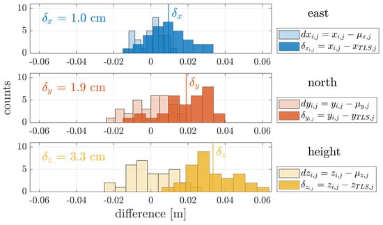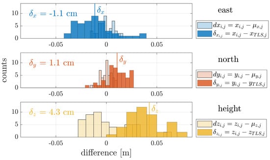 The histograms in Figure 8 combine the results for four UAV flights and the differences for target coordinates in East, North and height direction. The results are shown together for all targets indicated with the index i for the corresponding data set and index j for the target number.
