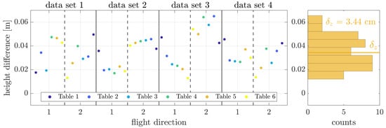 Since the uncertainty in the vertical direction is typically worse than the horizontal direction, the tables within the study area are used for the additional analysis of the height component. Therefore, the described plane estimation from Experiment (1) is used for the determination of table heights for a given position on the table. The estimated ellipsoidal heights are compared with the reference from the TLS point cloud. The six tables within the study are measured again twice for one data set as before described for the target evaluation. The results for the individual flights are shown in Figure 9 with a summary of the whole data set in the histogram on the right.
