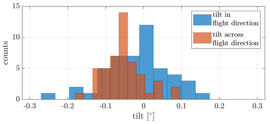 The mean tilt across flight direction is with a RMSE of 0.085 and the mean tilt in flight direction is with a RMSE of . The tilt estimates for the precision are nearly the same and the standard deviation is within the same magnitude.