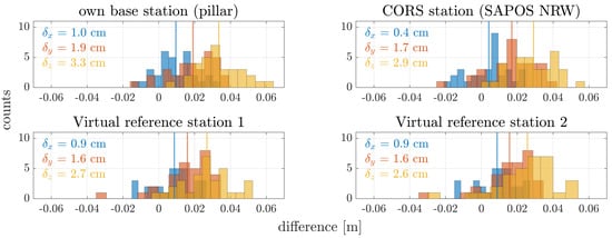 Difference of the estimated target coordinates compared to the TLS reference when using different master stations for the trajectory estimation. In addition to the own master station used before, a CORS station and two VRS are used. The histograms show the combined results for four flights and all targets included considering the east (blue), north (red) and height (yellow) coordinates.