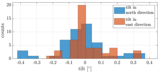 With these results, various conclusions can be drawn about the precision and absolute accuracy. Due to the scan configuration, the roll angle and the corresponding calibration parameter can be analyzed perfectly. A systematic error in the roll angle would lead to an offset respectively tilt of the point clouds from the flights in the opposite direction. With the histogram of the tilt parameter across the flight direction, a systematic error can be excluded. The small systematic offset with the mean value of can be classified as non-significant. The standard deviation for both tilt directions is another measure of the high precision of the system for multiple flights. Based on the table size, a tilt of would result in a height offset of less than 0.2 cm, which is within the noise level of the UAV-based laser scanning system and also the limitation imposed by the accuracy of the TLS reference.