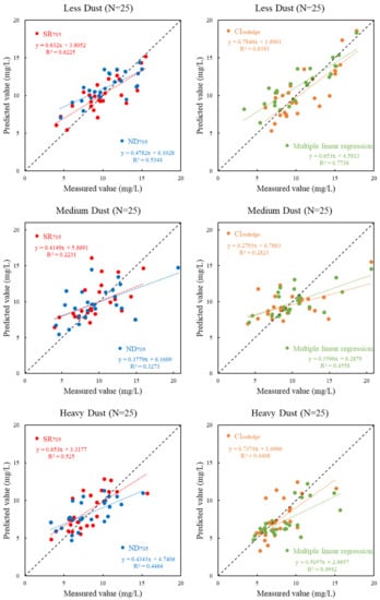 | Less dust | SR705 | y = 3.5774 *SR705 − 0.9945 | 0.6689 |