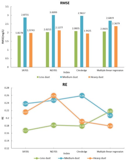 - Dust deposition affected the accuracy of the application of reflectance spectroscopy to chlorophyll concentration estimation. Different sensitive vegetation indexes had different effects. SR705 and CIrededge vegetation indexes were suitable to establish a chlorophyll-a concentration prediction model. The prediction effect under the level of “Less dust” was the best, which also proved that the deposition of dust had a significant interference effect on the estimation of chlorophyll-a concentration.