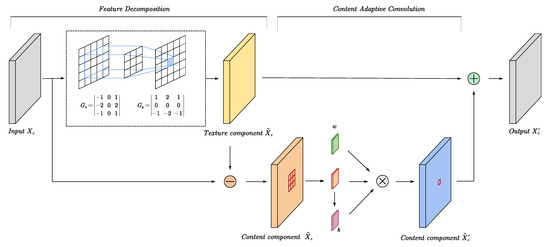 While the gradient of the image is considered to contain the texture information of the image, we first extract the gradient of the image as the texture component in the image and keep the texture component unchanged, and then perform a convolution operation on the content component. Since the goal of the module we designed is not to change the number of channels in the feature map, the subsequent channels are unified to c. The standard convolution of a content component and of the processing of content components can be defined as: