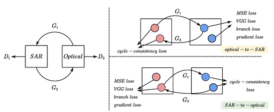 Cycle consistency loss was proposed in CycleGAN [21]. For each input SAR image x, it is converted to by the generator , and then converted to by the generator . The input x is expected to be consistent with , and the cycle-consistency loss is as follows: