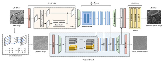 The goal of the gradient branch is to estimate the conversion of the gradient map between the SAR image and the optical image. The gradient branch first obtains the gradient map from the input image, just as the proposed EPC does. The gradient map can be obtained by calculating the differences between pixels, which can be realized by a convolutional layer with a fixed kernel. The acquisition of the gradient map can be expressed as: