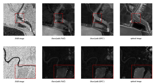 PAC is pixel adaptive convolution, proposed in [34], with excellent performance, which modifies the weight of the filter by the content in each window. However, the weight modification is not effectively restricted in PAC and the content may have an excessive influence on the weight of the filter. Therefore, the feature map used to influence the weight of the filter usually has a very small coefficient, which should be obtained through multiple adjustments, to avoid excessive influence in the experiment in [34]. At the same time, the coefficient may not be optimal for each image due to differences between images. We effectively restrict the weight modification through regularization in EPC. In addition, the structural information in SAR images may be lost or blurred when PAC modifies the filter weight, and our method can effectively retain the texture information of the SAR image. In order to prove the effectiveness of EPC, we conducted a comparative experiment in which the only difference between the EPCGAN and EPCGAN(PAC) was which model was chosen out of PAC and EPC.