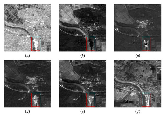 A visual comparison of different loss functions. (a) SEN-1 SAR image. (b) EPCGAN (without MSE loss). (c) EPCGAN (without VGG loss). (d) EPCGAN (without grad loss). (e) EPCGAN. (f) SEN-2 optical image.