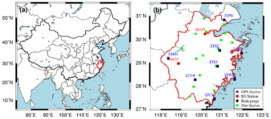 (a) Location of Zhejiang province in China. (b) The geographic distributions of the primary GPS CORS, rain gauge, radiosonde and meteorological stations used in this study, all GPS stations are from the Zhejiang CORS Network.