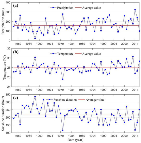 Monthly time series of (a) accumulated precipitation, (b) temperature and (c) accumulated sunshine duration in August for the past 50 years (1957–2016).