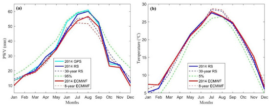 Precipitation events are highly correlated with temperature change [31]. It is found that PWV increases with air temperature by about 7% K-1 according to the Clausius-Clapeyron (C-C) relation when the relative humidity is a constant in the lower atmosphere [32]. Therefore, the PWV and temperature changes in the extreme period of August 2014 are further analyzed. Figure 4 compares the monthly-averaged 2014 GPS data as well as the monthly-averaged 2014 radiosonde data and ECMWF data to 30 and eight years of monthly-averaged radiosonde and ECMWF data, respectively. It can be observed from Figure 4a that 2014 PWV monthly average derived from GPS, radiosonde, and ECMWF are higher than the climatological one based on 30-year radiosonde data recorded in August. The monthly average PWV derived from GPS and radiosonde data is more than 60 mm, approximately 10% higher than the long-term climatological monthly average. Additionally, the monthly average of PWV derived from ECMWF is around 57 mm, also approximately 10% higher than the monthly average of 8-year ECMWF data. It is also noted that the monthly average of PWV is above the 95th percentile of normal climatologic values based on the 30 years of monthly-averaged radiosonde data. For the temperature comparison (Figure 4b), the temperature monthly average is lower than the climatologic one. The monthly average temperature in August 2014 is about 27 °C, which is lower than the long-term climatological monthly average by 7%. It was also observed that the monthly average of temperature is lower than the 5th percentile of its normal climatological value calculated using the monthly averaged radiosonde data of 30 years. Monthly-averaged PWV and temperature in August 2014 exceed the 95th and are less than 5th, percentiles of long-term climatological values, respectively, which represents the climate abnormality in August 2014 in terms of the magnitude and timing of climatic factors.