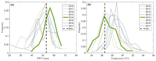 In addition, the frequency distributions of PWV and temperature are also analyzed in August 2014 to verify the extreme climatic anomaly [12,33]. Figure 5 gives the statistical frequency distributions of PWV and temperature for Augusts from 2010 to 2017 using the data from the ECMWF ERA-Interim data. It can be seen that the frequency distribution of PWV exceeded 95th percentiles of 30-year monthly data derived from radiosonde data while that of temperature was less than 5th percentiles of 30-year monthly data. Such a result shows how anomalous August 2014 was. According to the above results it can be concluded that the temporal datasets of temperature, sunshine duration or even NDVI, is observed something cyclical, but the precipitation can also be detected by the abnormal change of those factors.