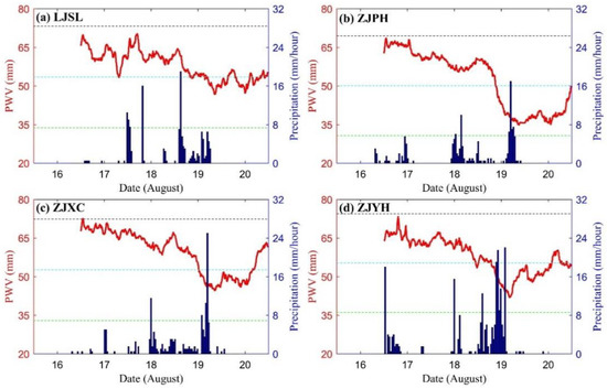 A time series of 5 min GPS PWV compared with 1-hourly precipitation at corresponding rain gauges from 17–20 August 2014. The green, magenta and black dashed lines indicate the PWV long-term median, 1 and 2 standard deviations above the PWV median, respectively. (a–d) are the data of LJSL, ZJPH, ZJXC, ZJYH stations respectively.
