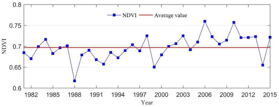 Zhejiang province is mainly covered by the evergreen vegetation according to the land cover maps provided by the European Space Agency (ESA) Glob Cover Portal, which is produced using the 300 m observations from MERIS sensors on board the ENVISAT satellite mission [41]. The average value of NDVI over 35 years (1981–2015) is about 0.7 in Zhejiang province. The NDVI data are selected for the vegetation growing season, which is regarded as those months with the values of NDVI and temperature are larger than 0.2 and 0 °C, respectively [42]. Figure 8 shows the time series of NDVI in August derived from the GIMMS3g dataset for the past 35 years (1981–2015). It is observed, from Figure 8, that the NDVI value in August 2014 is below the long-term NDVI average and the third least value in the past 35 years.
