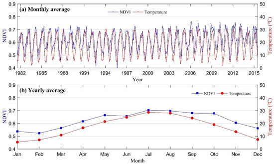 NDVI time series change with temperature during the vegetation growing season, (a) is the monthly average of NDVI and temperature and (b) is the yearly-averaged NDVI and temperature from the 34-year data.