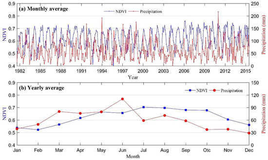 NDVI time series change with precipitation during the vegetation growing season, (a) is the monthly average of NDVI and precipitation and (b) is the yearly-averaged NDVI and precipitation from the 34-year data.