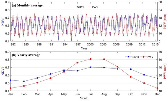 NDVI time series change with PWV during the vegetation growing season, (a) is the monthly average of NDVI and PWV and (b) is the yearly-averaged NDVI and PWV from the 34-year data.