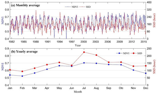 NDVI time series change with sunshine duration (SSD) during the vegetation growing season, (a) is the monthly average of NDVI and SSD and (b) is the yearly-averaged NDVI and SSD from the 34-year data.