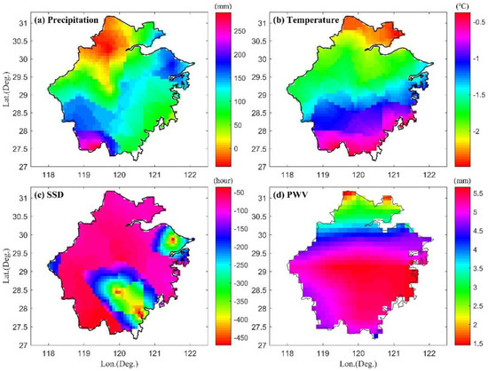 Spatial distributions of anomalous values of monthly accumulated precipitation (a), monthly temperature (b), monthly total sunshine duration (c), and monthly PWV (d) calculated based on the 8 years (2008–2015) of average values.