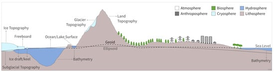 Digital topography records the surface separating the lithosphere from the atmosphere (or space for atmosphere-free solid celestial bodies). Challenges arise when intermediate layers such as the hydrosphere, cryosphere, biosphere and anthroposphere intervene (Figure 1 and Table 1), and may not be handled consistently even within a single elevation model. For example, ETOPO1 [12] removes sea ice from the oceans but leaves the continental ice sheets for Greenland and Antarctica. The oceanic hydrosphere is removed, and some lakes (e.g., the Caspian Sea and the North American Great Lakes), but not the lakes in the East African Rift Valleys. The treatment of biosphere and anthroposphere add to the challenge of picking the desired surface and accurately recording it. In addition, the particular technology used to collect the topographic data also influences which surface is being captured. For example, radar signals might experience some degree of penetration within the vegetation canopy, depending on the band or wavelength they are acting in; laser altimeters can measure distinct intermediate surfaces in the vegetation structure; while the raw data from stereophotography represent the top of canopy.