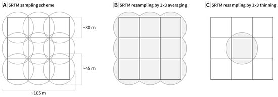 Except for NASADEM, all of the DEMs in Table 1 are stored in the GeoTIFF format; 1″ grids all use area-based sampling and the elevations from the radar or optical sensors reflect a single, integrated elevation over the sampling area. The 3″ grids vary in their sampling strategy; some average a number of 1″ cells, and others take the central value so that the points in common to the 1″ and 3″ grids will have the same elevation (Figure 3). Different versions of the SRTM dataset have used both approaches to resampling.