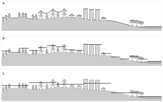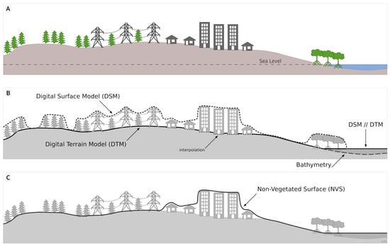 Figure 4. (A) Terrain being represented by a (B) digital surface model (DSM), and digital terrain model (DTM), and (C) a non-vegetated surface (NVS). - DTM (digital terrain model): A DEM that records the boundary between the lithosphere and the atmosphere, without biosphere and anthroposphere, also called a “bare-earth” DEM. The treatment of hydrosphere, cryosphere, and voids (e.g., excluded buildings, water and trees) must be specified and clearly localized, e.g., by respective masks (Figure 4).