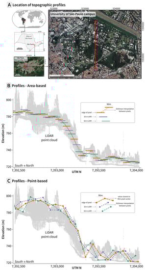 Lidar point cloud from a university campus in Brazil. (A) Location of topographic profiles. (B) Area-based, which depicts the average elevation in the pixel. (C) Point-based DEM representation, which uses a single point elevation for the pixel (here the closest value to the 90 m pixel center).